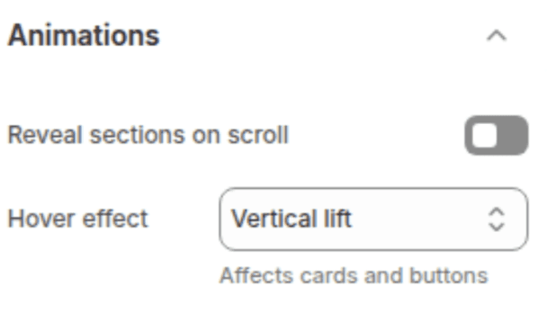 Animation when hovering over cards and images: None, Vertical lift, or 3D lift.