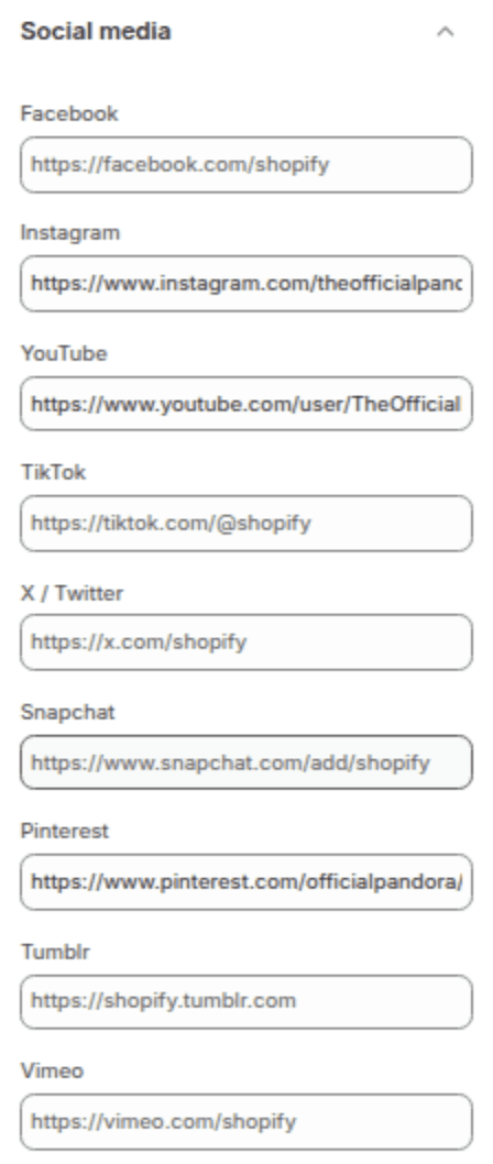 Add links to your social media profiles. Icons will automatically appear in the footer and any social blocks.