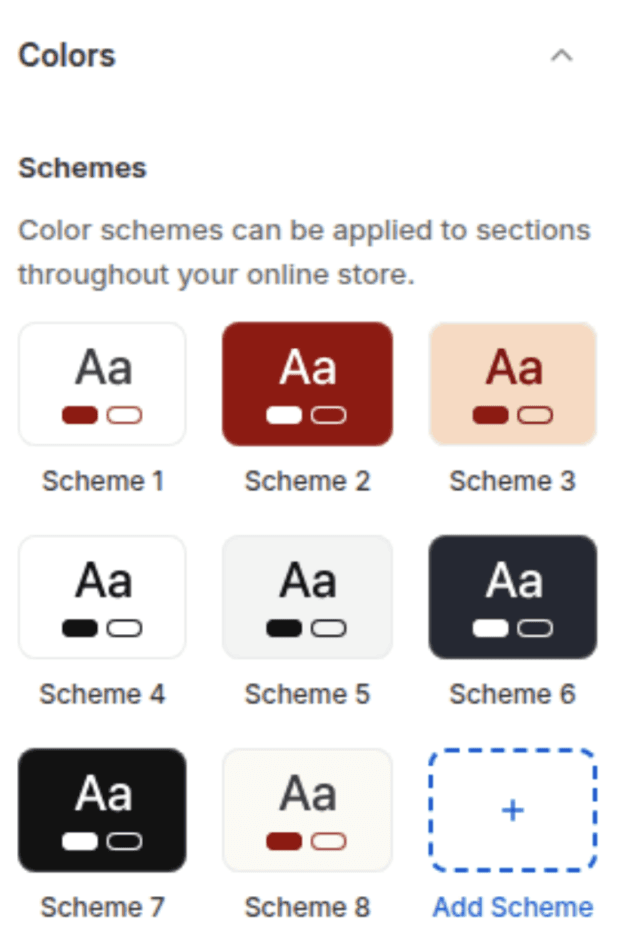 Define your store's color palette through reusable Color Schemes. Each scheme contains the following color roles:
