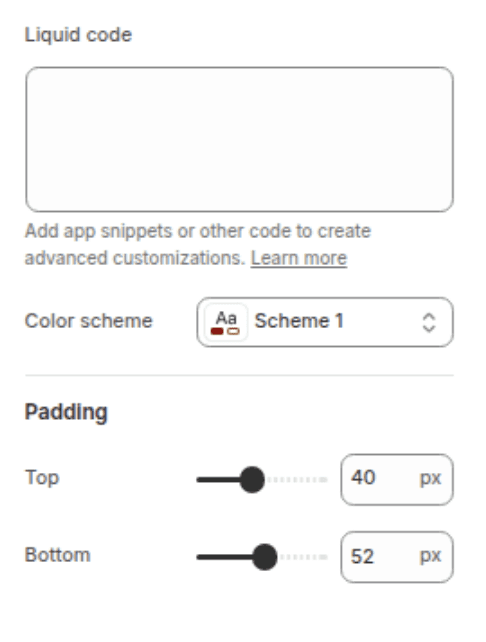 <style>and<script>tags directly inside the Liquid field if you need to add scoped styles or scripts alongside your custom markup.Color Scheme: The section automatically wraps your output in a