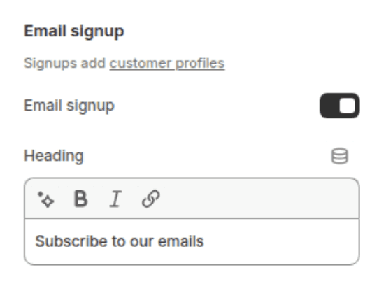 The heading displayed above the email input field in the newsletter form. Supports inline rich text (bold, italic, links). Leave blank to hide the heading.