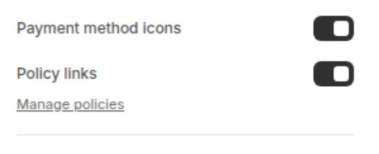 When enabled, displays links to all active store policies (Refund Policy, Privacy Policy, Terms of Service, Shipping Policy, etc.) in the footer's bottom bar copyright area. Policies must be configured in Shopify Admin > Settings > Policies.