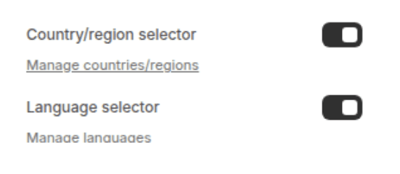 When enabled, displays a country/region dropdown in the footer's bottom bar. Only visible when the store has multiple countries configured in Shopify Markets.