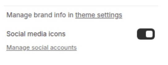 Social Icons Require Theme Settings URLs: The Show social media icons setting in both the footer section settings and the Brand Information block only works if social platform URLs are configured in Theme Settings > Social media. Enabling the setting without any URLs configured will show nothing — no icons, no empty placeholders.