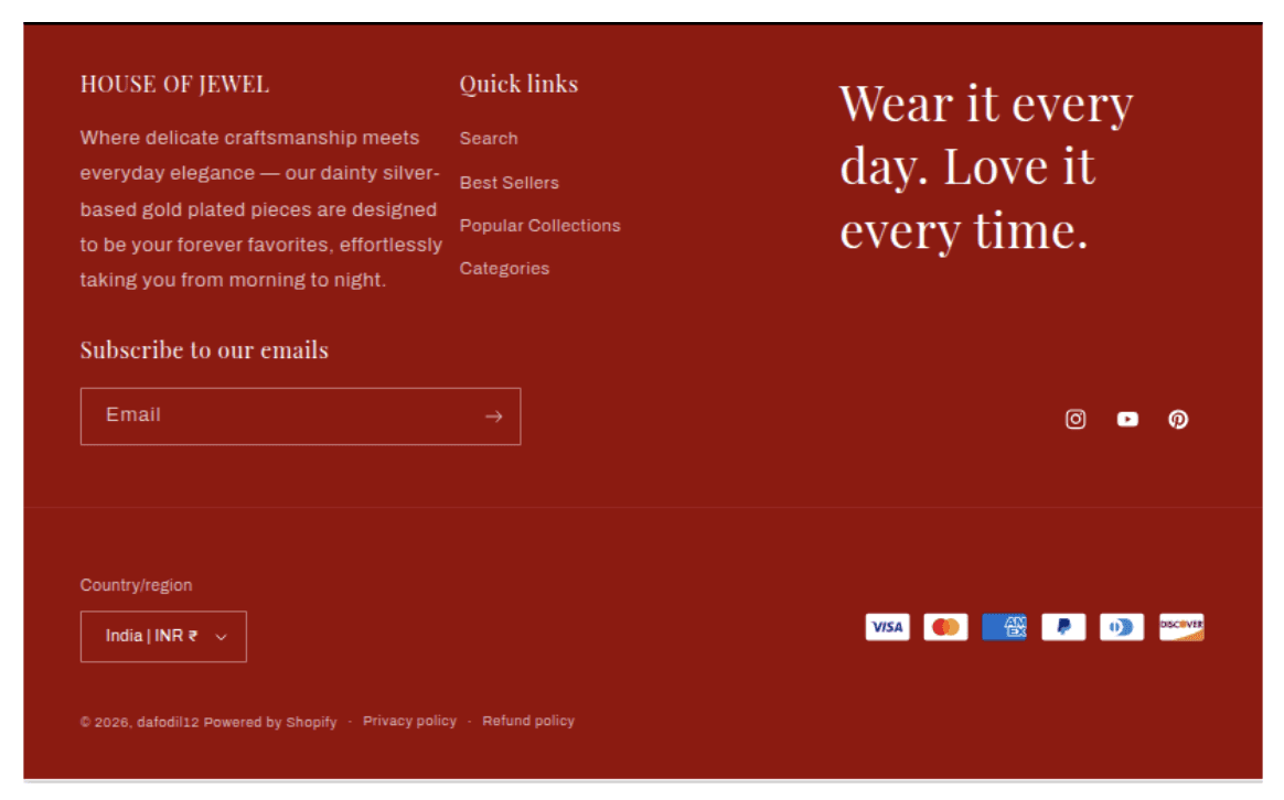 Copyright Notice: Automatically displays the current year and store name with a link to the homepage.