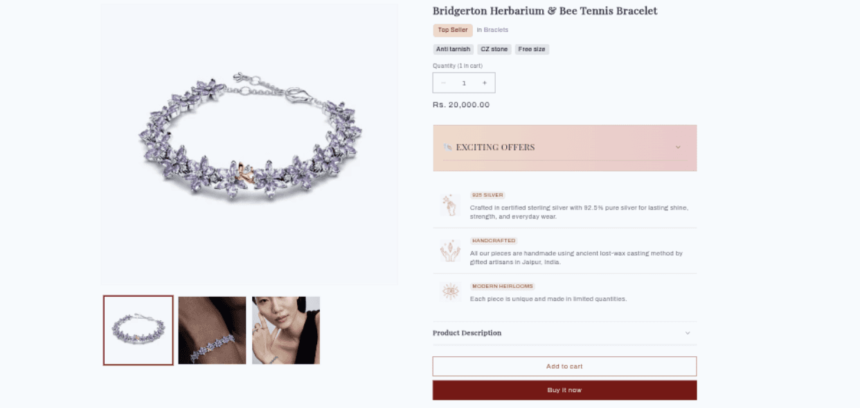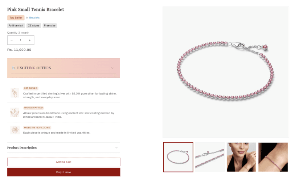 [Screenshot: Full product page showing media gallery on the left and product info on the right]