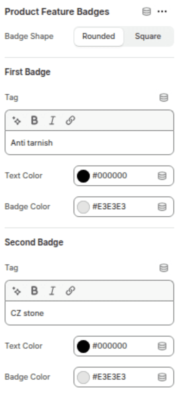 Displays up to 4 colorful badges to highlight key selling points (e.g., "Organic", "Best Seller", "Free Shipping").
