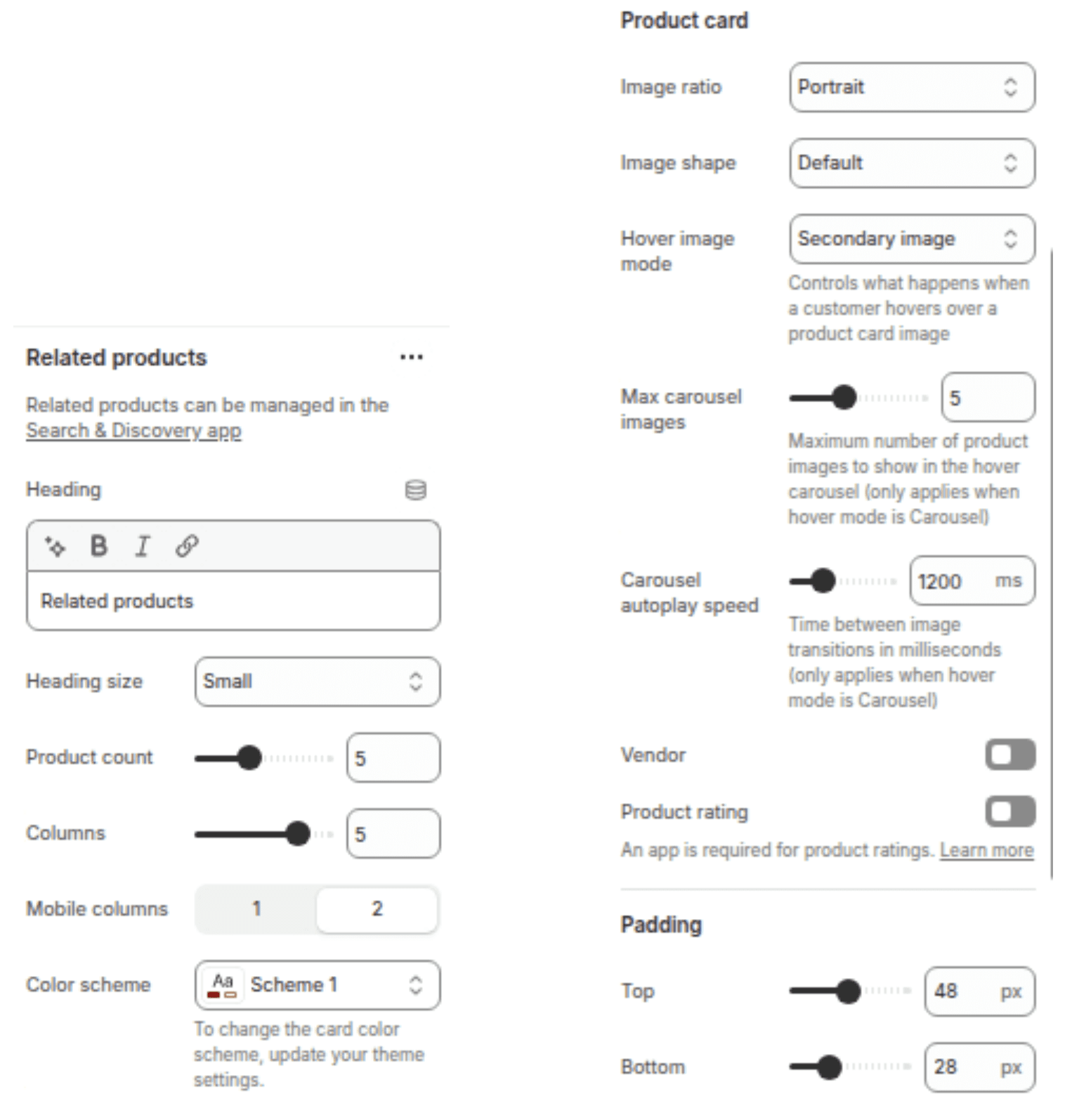 Product Card Options: Control image ratio, image shape, secondary image hover, vendor name, and star ratings.