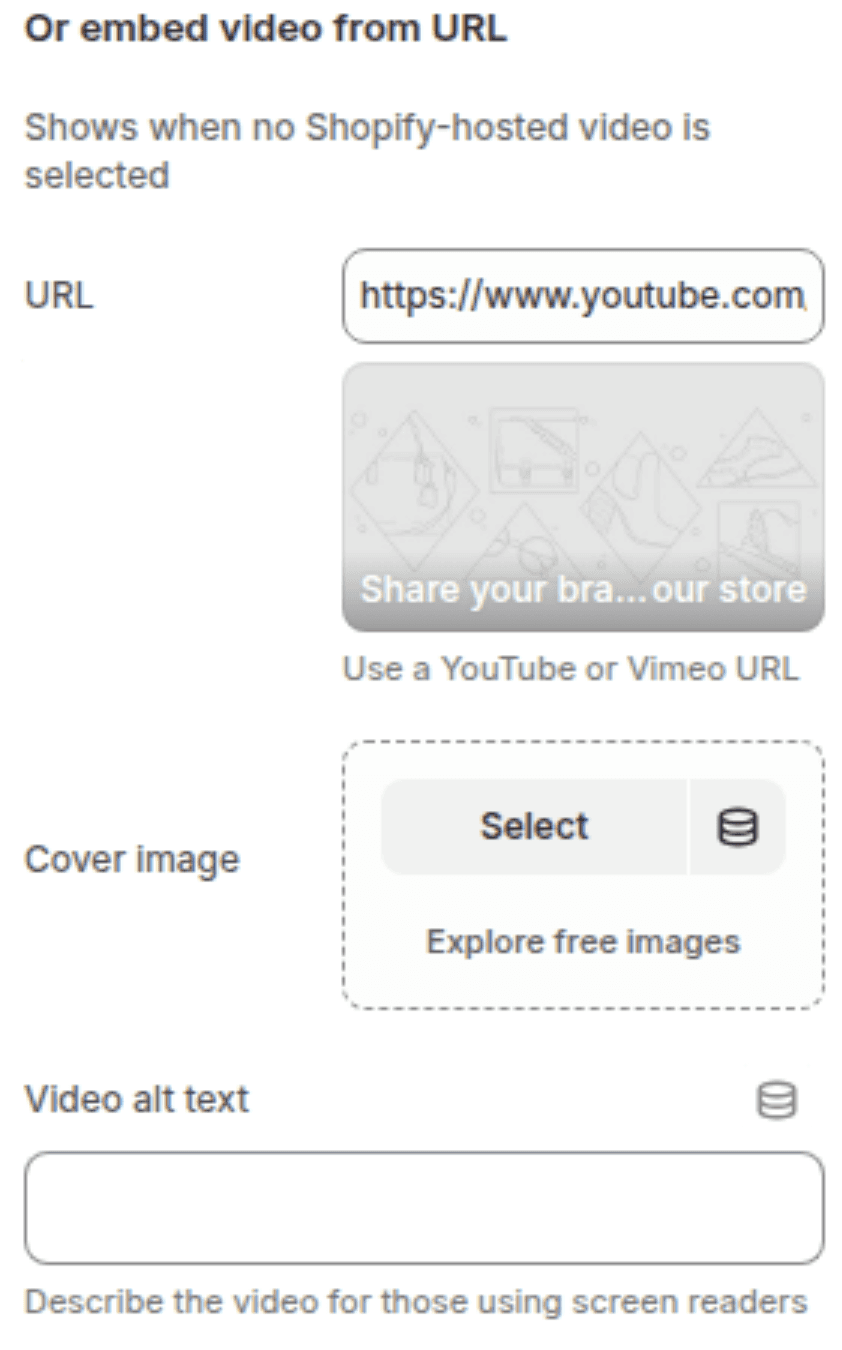 Use this option when embedding a video from YouTube or Vimeo. This group is only used when no Shopify-hosted video is selected above.